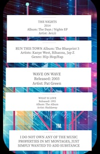 ON THE LEFT IS A LISTING OF ALL SONGS PLAYED THROUGH MY MONTAGES INCUDES ARTIST, RELEASE DATE AND ALBUM